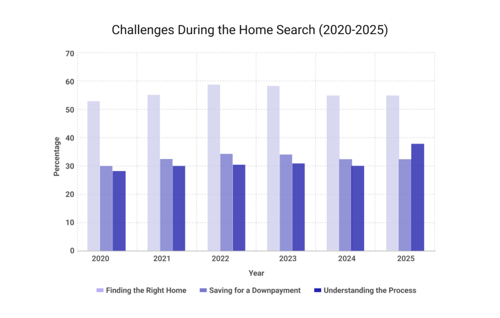 Many also struggled with understanding the home-buying process, which 38% identified as a major challenge in 2025. First-time buyers faced both financial and procedural barriers during the search.
