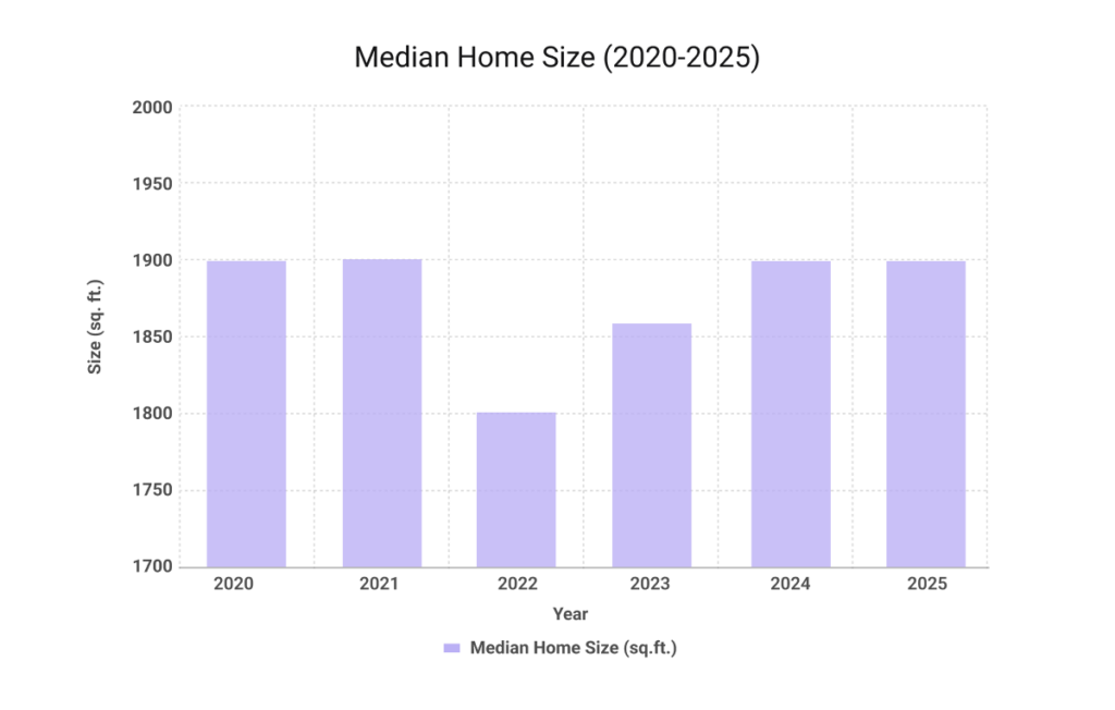 From 2020 to 2025, median home size changed only slightly. It measured 1,900 square feet in 2020, dropped to 1,800 in 2022, and returned to 1,900 square feet in both 2024 and 2025.