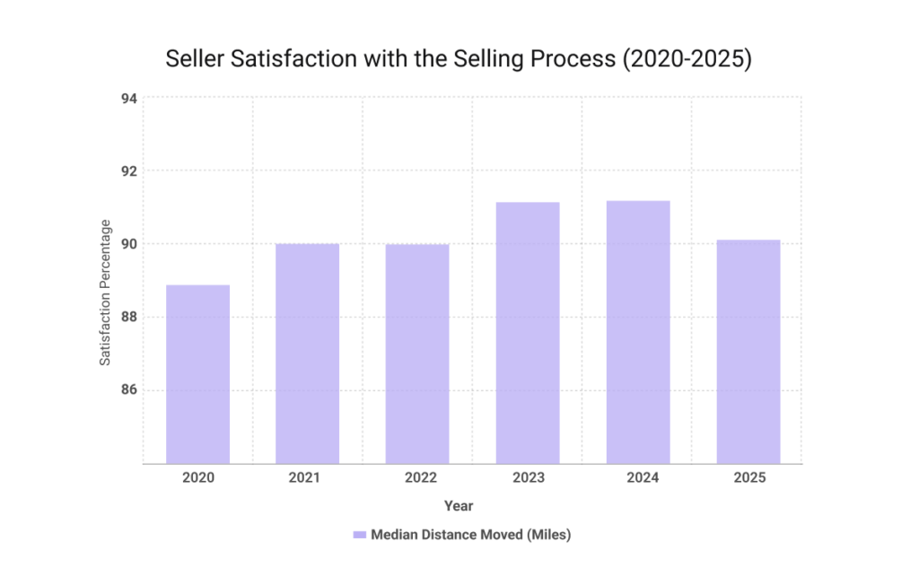 Seller satisfaction remained high throughout the period. It increased from 89% in 2020 to 91% in 2023 and 2024 before easing slightly to 90% in 2025.